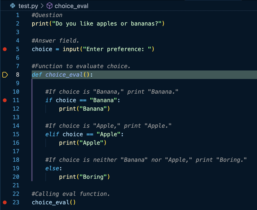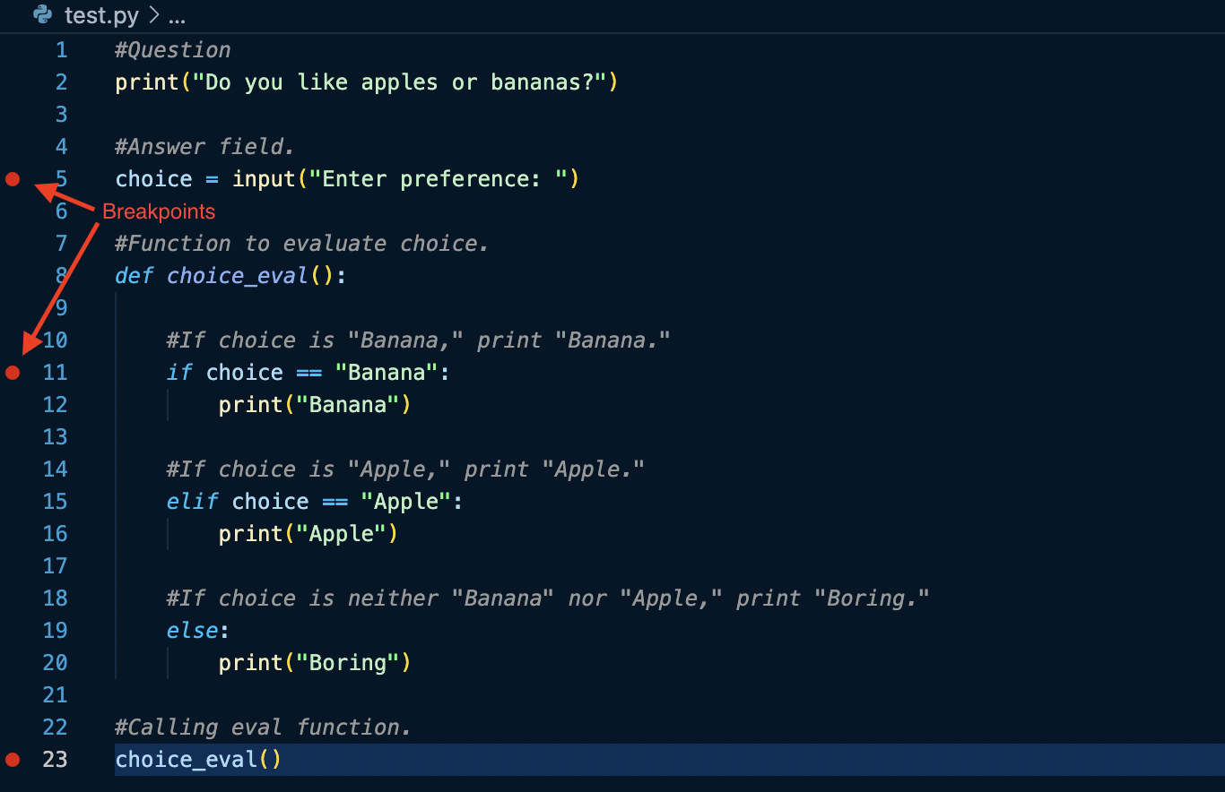 Breakpoints will be one of the most quintessential tools when debugging as a programmer. This tool, and the others mainly apply to interpreted programming languages, as interpreted languages run line by line as opposed to running the entire file at once like other programming languages. In case you are wondering, interpreted languages include languages like Python, JavaScript, Ruby, etc.